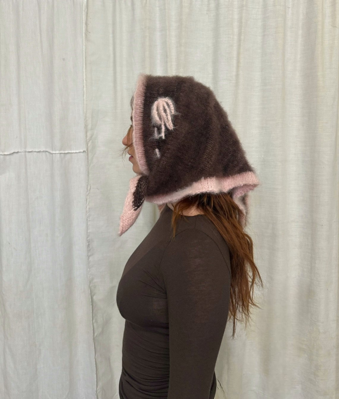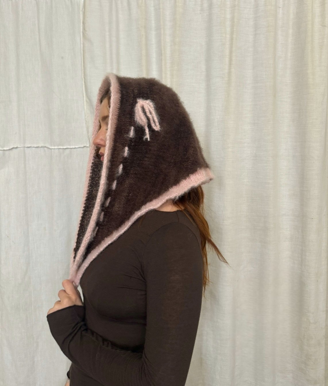 yummy deep purple with bow detail . machine knit, brushed wool & mohair blend . lightweight but warm, with a soft fuzzy halo